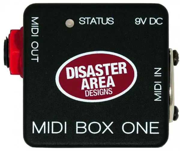 The DISASTER AREA MIDI Box One converts standard 5-pin (DIN) MIDI communications to a variety of 1/4″ formats. Featuring a single MIDI output, the MIDI Box One can output MIDI on either the tip or ring of its 1/4? jack, or send MIDI on both at the same time. Configuration is easy, using the DIP switches on the underside of the MIDI Box One.
