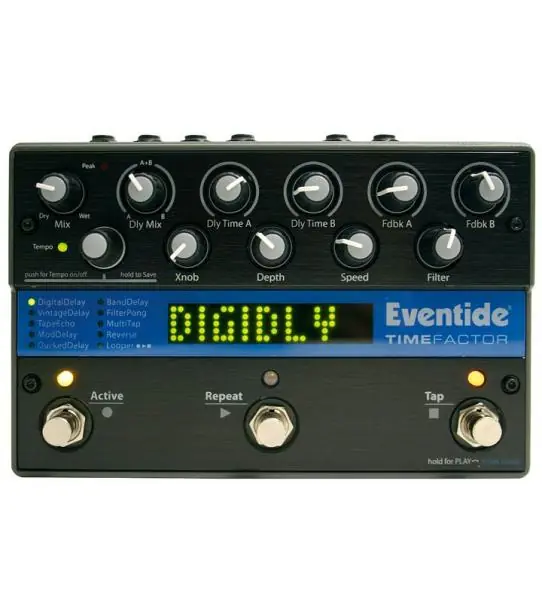 Reverb, delay & echo effect pedal EVENTIDE Timefactor. Nine dual delays with dedicated mix, time and feedback controls for the two independent A and B lines. Delay types include MultiTap, Reverse, Mod, Tape, Ducked and AutoPan. Each effect can operate in stereo or dual mono or straight mono and each can have its own tempo subdivision for creative rhythmic echoes. TimeFactor also includes a Looper with variable speed and loop head/tail editing.
