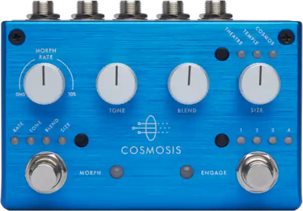 The COSMOSIS REVERB is a reverb pedal offered by the Pigtronix brand.After years of work, Cosmosis is the first high-fidelity stereo surround reverb that allows musicians to create and manipulate three original spaces in real time: Theater, Temple and Cosmos.In addition to controls for reverb size, wet/dry mix and filtering, Cosmosis offers a unique Morph function. This feature allows musicians to change their reverb settings in real time by pressing the left footswitch. Cosmosis’ three spatial algorithms are all original and truly unique.Cosmosis’ Morph function makes it easy to trigger a gradual change in reverb parameters over a duration set by the Morph Rate knob. Musicians can assign “red” and “green” values ??to the Tone, Blend and Size knobs, then use the Morph footswitch to oscillate between these two settings at the desired speed. Any combination of buttons can be assigned to morphing.