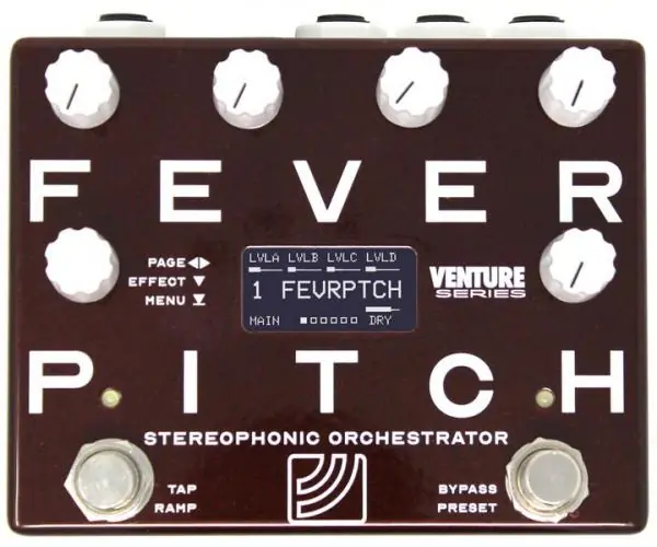 At the core of the ALEXANDER Venture Series Fever Pitch Stereophonic Orchestrator programmable effect pedal is a set of four stereo pitch shifters, followed by reverb/delay, stereo tremolo/pan, and stereo chorus/vibrato. These effects can be blended and fine-tuned to your taste, whether you’re looking to add a subtle bit of depth and texture to their sound or you want to craft colossal, otherworldly soundscapes.With so much complexity under the hood, the Fever Pitch can be intimidating at first, but using it is pretty simple. Just power up the pedal with a 9V center negative power supply, plug your instrument into the pedal’s INPUT jack, run a cable from the LEFT / TRS jack to your amplifier, and you’ll be all set to start building massive, cinematic scores.Once powered on, the Fever Pitch’s high-resolution OLED screen displays an intuitive interface, allowing for easy, effortless tone-tweaking. Turning the pedal’s lower left knob navigates between pages of the user interface, and each page has a new group of effect controls to tweak. Tap the encoder to switch between the delay and reverb modes or hold it to access the Setup, Preset Save, or Scale Save menus. The pedal’s other five knobs adjust the parameters on the current page. After you’ve created the effect of your dreams, you’ll be able to save it to any one of the Fever Pitch’s 32 preset banks to be recalled at a moment’s notice. The Fever Pitch is also fully compatible with MIDI and expression pedals, allowing players to use the pedal’s ramp function to move between expression positions automatically. Turn the Ramp knob to set the speed of the ramp, and turn the Trig knob to select the trigger mode (TOGG, MOM, and REPT,) and you’ll be able to sweep between settings for maximum sonic expression.If you’ve been searching for the ultimate pitch-shifting pedal to unlock your true creative potential, the Alexander Pedals Fever Pitch Stereophonic Orchestrator is sure to impress.