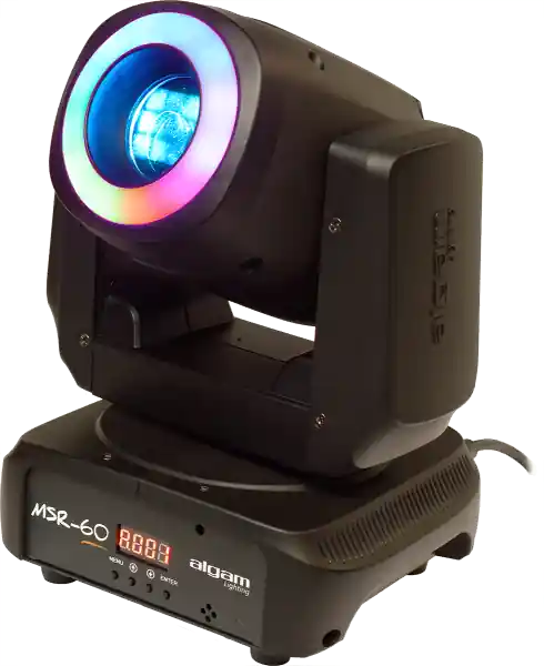The Algam Lighting MSR 60 is a Lyre SPOT LED 60W + LED ring.The MSR 60 Spot Lyre from Algam Lighting is perfect for bringing life to all your evenings and performances. Compact and lightweight at just 3 kg, this moving head spot projects a remarkably efficient beam thanks to its 60W white LED. With its 8-gobo wheel coupled with an 8-color wheel, its motorized focus and triple prism, it allows for a wide range of colorful effects to be displayed, ready to meet any situation.