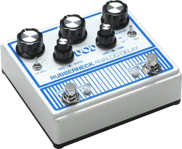 The new DOD Rubberneck Analog Delay has double the features with the cool new double-wide chassis. The Rubberneck boasts over a second of warm and musical 100% analog repeats you crave, along with tap-tempo, subdivisions, and tails. Double concentric knobs give you independent control of the Modulation Rate and Depth as well as Gain and Tone of the delay.Double footswitches allow for unique extended features like user customizable momentary control of oscillation and momentary control of the dizzying pitch sweep of “Rubbernecking.” These extended features are controlled by individual clear mini knobs that double as multi-color LED status indicators. Feedback loop send/return, remote footswitch control, true bypass, and rugged metal construction, make the Rubberneck Analog Delay the must have delay of the year.The Rubberneck also has jacks to allow FS3X 3-button remote foot switching, and a send and return so you can add external effects to the delay path.The DOD Rubberneck uses a 9VDC power supply to easily integrate into your existing pedalboard.