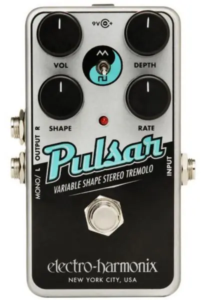 Equipped with a collection of tremolo-modulating waveforms and the option of operating in Triangle or Square Wave modes, the EHX Nano Pulsar Variable Shape Stereo Tremolo compact effect pedal is a tremolo/panner treasure chest. In mono, it’s simply amazing, or, connect it in stereo to create shifting waves of sound that surround you and fill your space with weaving, pulsating energy.There’s often a perceived volume drop with tremolo when the effect is engaged so Nano Pulsar features a Volume control. It allows a player to fine-tune their output level when the effect is on, and is a very useful addition.