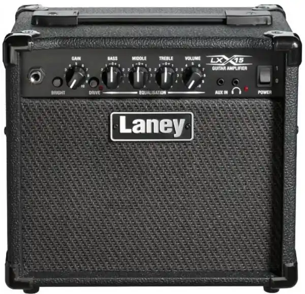 The LANEY LX15 Black solid-state electric guitar amplifier delivers 15 watts RMS of huge Laney guitar tone into a pair of twin 5″ loudspeakers, at a very modest price. With a 3-band EQ tone stack plus a Drive switch to add distortion, an assortment of great tones can be dialled in from spanky clean to overdrive sounds with real punch.The mini-jack AUX input allows for connection of a playback device such as MP3/ipod/CD for jamming along to songs or backing tracks, plus there is a headphone socket for doing so quietly.