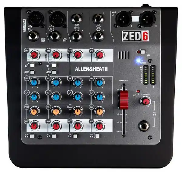 Compact 6 input analogue mixer // ZED-6 has been created for musicians, singer / songwriters and venues seeking Allen & Heath’s renowned build and audio quality in a compact, portable format. Whether it’s bouncing ideas around at home, performing live or recording tracks to share on YouTube and Soundcloud, ZED-6 is a versatile companion for every step of the creative journey. Featuring the new GSPre boutique preamp design, developed from the revered GS-R24 studio recording console, the ZED boasts exceptionally low noise and massive headroom, with a signature analogue warmth and depth. Guitarists will be pleased to know that ZED-6 comes with a pair of Guitar DI high impedance inputs, allowing guitars to be plugged straight into the mixer without the hassle and expense of carrying separate DI boxes.MADE FOR GUITARSZED-6 comes with two Guitar DI high impedance jack inputs, allowing guitars to be plugged straight into the mixer without the need for DI boxes. That’s one less piece of gear to buy, carry and set up.ROAD TOUGHAll ZED mixers are designed and built to Allen & Heath’s legendary touring grade standards to ensure a long life in the toughest environments. All channels are on individual, vertical circuit boards and all rotary controls are secured to the front panel with a steel nut to guard against impact damage.