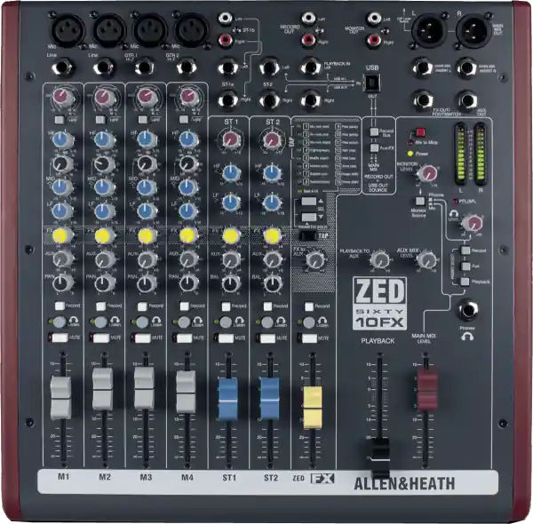 Live or in the studio, ZED60-10FX Multipurpose Mixer with FX for Live Sound and Recording is an ultra-portable mixer for solo artists and small bands.Based on our top selling ZED-10FX, the new ZED60-10FX adds premium quality 60mm faders for that intuitive, tactile mixing experience.This mixer is a guitarist’s dream. Two of the 4 mono channels have high impedance jack inputs that can take a normal line level or a low level input from a guitar pickup, so guitars can be plugged straight into the mixer without the need for DI boxes. These inputs have been crafted to recreate the sound of a classic tube preamp in a combo or head amp for incredible definition and warmth. Two stereo inputs are provided for MP3/CD players or keyboards.ZED60-10FX comes with configurable USB audio in/out, making it easy to capture a stereo recording at the gig or in the studio. The mixer is equipped with professional XLR main stereo outputs, a flexible monitoring section with headphone and speaker feed outputs, and 16 stunning FX. Most important of all, ZED60-10FX lives up to the audio and build quality standards that have made Allen & Heath one of the most trusted names in professional audio for more than 40 years.