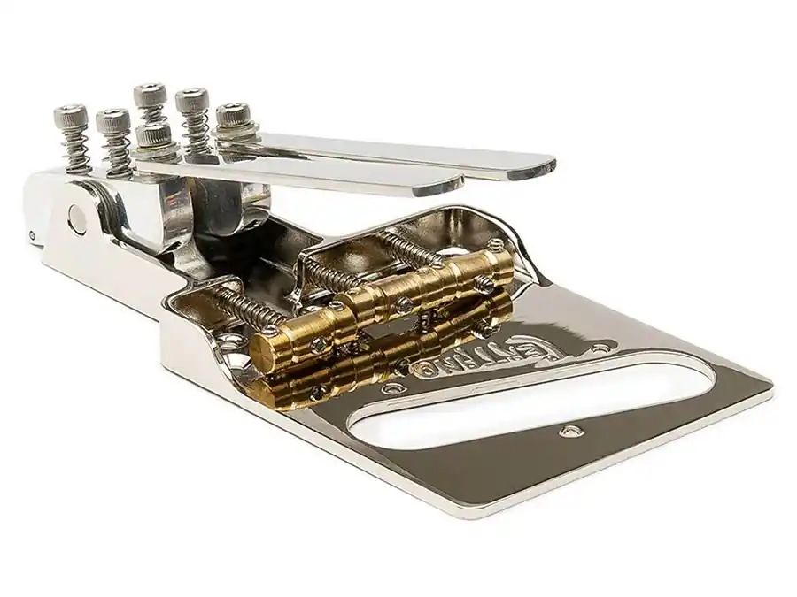 Features: – Drop-in replacement for most vintage-spec Telecaster bodies. 100% reversible.- Bends B and G strings up a half or whole step.- Levers can be used independently or in combination.- Tension-loaded stainless-steel arms for perfect positioning.- Ensures comfortable operation in normal playing position.- Compensated brass saddles for accurate intonation and vintage tone.- 2-1/8″ string spacing.- Front-slotted intonation screws for easy adjustments.- Available in Nickel and Chrome.- Includes 1/16″ and 3mm allen wrenches
