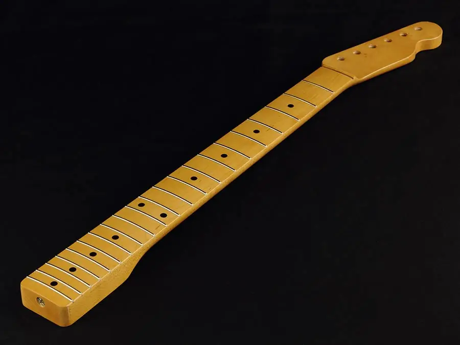 – 21 vintage frets (.079″ x .035″)- Solid maple neck with vintage tinted polyurethane finish- 7.25″ radius- Nut width 1-5/8″- Heel width 2-3/16″- Tuning peg hole diameter .340″- Truss rod adjustment at heel- Neck thickness .86″ at first fret, .97″ at twelfth fret