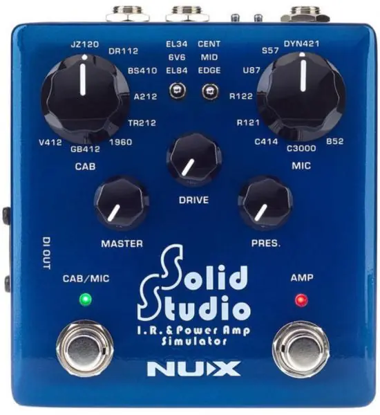 Over many years of research, NUX Verdugo Series Solid Studio NSS-5 IR & Power Amp Simulator guitar interface was specifically developed to fill the essential needs of discerning musicians and sound technicians, including the art of mic-ing instrument amplifiers on stage or in the studio. Solid Studio provides ease-of-use, reliability, versatility, and, above all, incredible audio quality.Virtual mic-ing is achieved by choosing 1 cabinet and 1 microphone, and fine-tuning the position of the microphone using the mic position switch. Plus, you can add the tube sound by engaging the power amp simulation.Solid Studio comes with 8 speaker cabinet simulations. All the cabinet models inside the Solid Studio sound and feel as great as their original counterparts.And there are 8 microphone models you can combine with any cabinets. Also, you can adjust microphone position for fine tuning.Solid Studio Power Amp Simulation offers three power tube models that deliver corresponding tonal characteristics: EL84, LE34 and 6V6.NUX Solid Studio has a 6.35mm mono input with an input signal level toggle switch (-10dB / +4dB) for fitting various instruments. And it has 3 outputs: simulation dedicated (TRS) STEREO OUTPUT and DI OUT, and a bypassed “THRU” output.Solid Studio is good for sitting between your pedals and audio interface for silent direct recording. Let the Solid Studio handle the speaker cabinet and microphone part. By placing the Solid Studio between the amp and the cabinet, while still using your real cabinet for stage monitoring, you can split a DI signal with cabinet simulation to the mixer from Solid studio. The Solid Studio DOES NOT provide NO LOAD to the amplifier, therefore, a real cabinet or a loadbox MUST be connected to the THRU jack of the Solid Studio, or there is risk of damaging the amplifier.The Solid Studio’s IR resolution is 2048 samples and 46ms, which is higher than the common quality standard that most of IR loaders are using today: 1024 samples and 20ms capturing length. Some well-known profiler devices offer 2048 samples / 40ms length.The highest resolution quality limit of the IR is 50ms, it is the REAL sound.Considering all the process on the signal from your guitar to your ear, Solid Studio delivers the signal faster than the blink of an eye with the greatest result. Thanks to Solid Studio’s high-quality processor and perfect algorithm, the signal latency from input to output is less than 1ms.What makes the Solid Studio standout? It offers 46ms length which means it can perfectly read all the frequencies. Comparing the length, 20ms is already enough to capture a sound profile with an efficient result but it’s not enough to catch the lower frequencies. That’s why devices with high-quality usually provide 40ms length – it means higher resolution and better quality.You can capture any speaker’s profile easily with Solid Studio. Create your own IR file and save it.