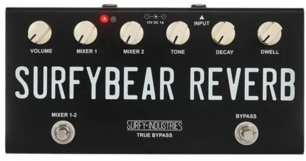 SURFY INDUSTRIES SurfyBear Compact Black offers the same features as the SurfyBear Classic but in a pedal format, and with a dual mixer control to switch between two reverb settings.SURFY INDUSTRIES SurfyBear Classic device features the same specifications of the Fender® 6G15® reverb unit replacing the tubes with JFET transistor technology. This is not a digital effect.Spring reverb technology has been well known for more than 50 years. One of the first reverb units available for electric guitars was the Fender® 6G15® standalone reverb, which has set the standard for generations of musicians. Still today, the unique sound of spring reverbs is very popular among guitarists.