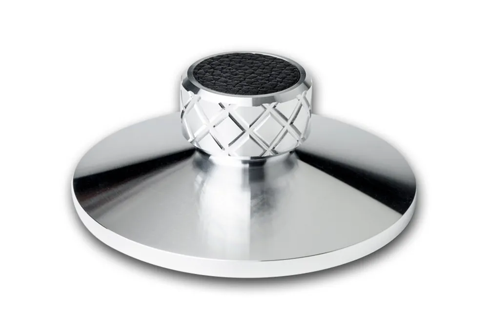 Clamp it is de echte oplossing, een accessoire met een klemmechanisme rond de centrale as, dat geen gewicht toevoegt, wat gerommel zou veroorzaken. U kunt de druk nauwkeurig aanpassen aan de staat van uw kromgetrokken platen. Het plaatsen van de klem is eenvoudig binnen enkele seconden gedaan. Dit accessoire zal niet alleen uw oren strelen, de prachtig bewerkte diamantgeslepen randen zullen er ook nog eens ontzettend cool uitzien op elke draaitafel!