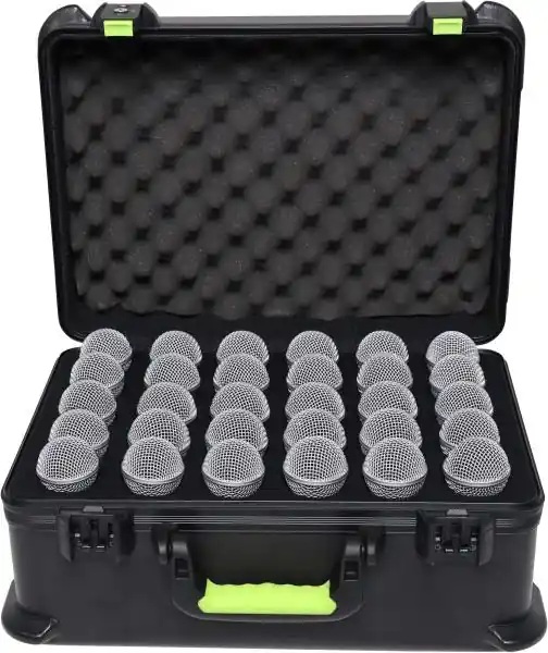 The Shure SH-MICCASE30 is a durable ATA-style case designed specifically to hold 30 wired microphones. If you travel frequently with your microphone set, the dedicated slots will keep them safe and protected from bumps and drops.You’ll also appreciate the TSA-approved locking latch, which makes traveling easy and secure when you need to fly.The case’s lightweight, compact design and ergonomic handle make it easy to carry when you’re on your way to your next gig.
