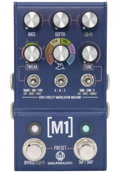 The WALRUS AUDIO Mako Series M1 High-Fidelity Modulation Machine is a programmable / MIDI / full stereo compact effect pedal, featuring six customized, studio-quality programs : Chorus, Phaser, Tremolo, Vibrato, Rotary, and Filter. Each program has a wealth of options to tune, tweak, customize and then save to one of nine onboard presets.A sound explorers delight, the M1 features a dedicated lo-fi knob allowing you to mix various lo-fi parameters to every program. Add subtle movement and texture to float under your playing or make a massive statement with a thick swirling chorus to choppy panning tremolo. Write your sonic story in any style and genre with the M1 High-Fidelity Modulation Machine.The M1 can save up to nine onboard presets, and 128 are accessible via MIDI. On-board presets are accessible with the bank switch. Cycle between presets in each bank by pressing Bypass and tap simultaneously. You will see the right LED change from Red to Green to Blue. Any adjustments made in a preset will change the tap LED to purple, indicating you have edited the preset.The M1 offers multiple input and output configurations : Mono In / Mono Out, Mono In / Stereo Out, Stereo In / Stereo Out.