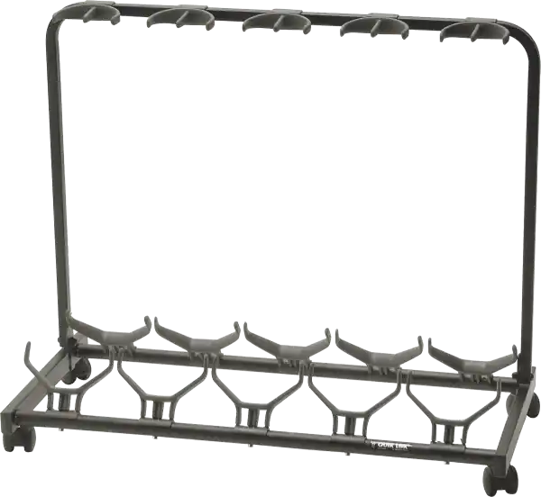The Stand for 5 guitars with casters is offered by the Quiklok brand.Rack stands fit both acoustic guitars and electric guitars. Each instrument support is covered with a layer of soft rubber, thus avoiding damage to the varnish of the guitar but also increasing its support. The neck holder allows you to position the guitar on both sides. These stands shine with their effectiveness when used on stage or in the studio.
