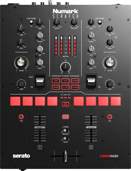 the NUmark Scratch is a Dj Scratch turntable.Including Serato DJ Pro and Serato DVS, featuring innoFADER approved technology, 6 shortcut buttons to Serato effects with dual activation lever, 8 performance pads, filter buttons anddedicated loops, the Scratch totally dominates its category.Numark® Scratch is a two-channel 24-bit mixer that combines professional features and a software suite at a particularly reasonable price. Combining aall-metal construction with advanced features such as an integrated Innofader crossfader,performance pads, an instant loop encoder and rocking levers for triggering thesoftware effects, Scratch is configured to exceed standards and become the new standard for mixing desksin this price category – while promising versatility, ease of use, robustness andperformance.