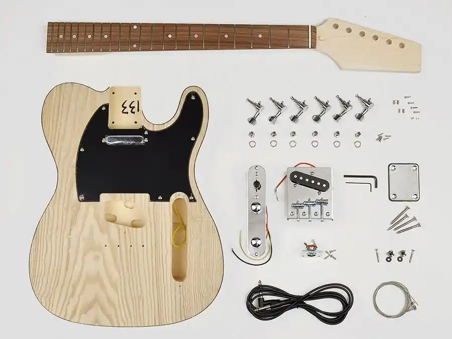 Alle benodigdheden (behalve gereedschap) zitten in het pakket: Elementen, schroeven, potmeters, schakelaars, stemmechanieken en snaren.