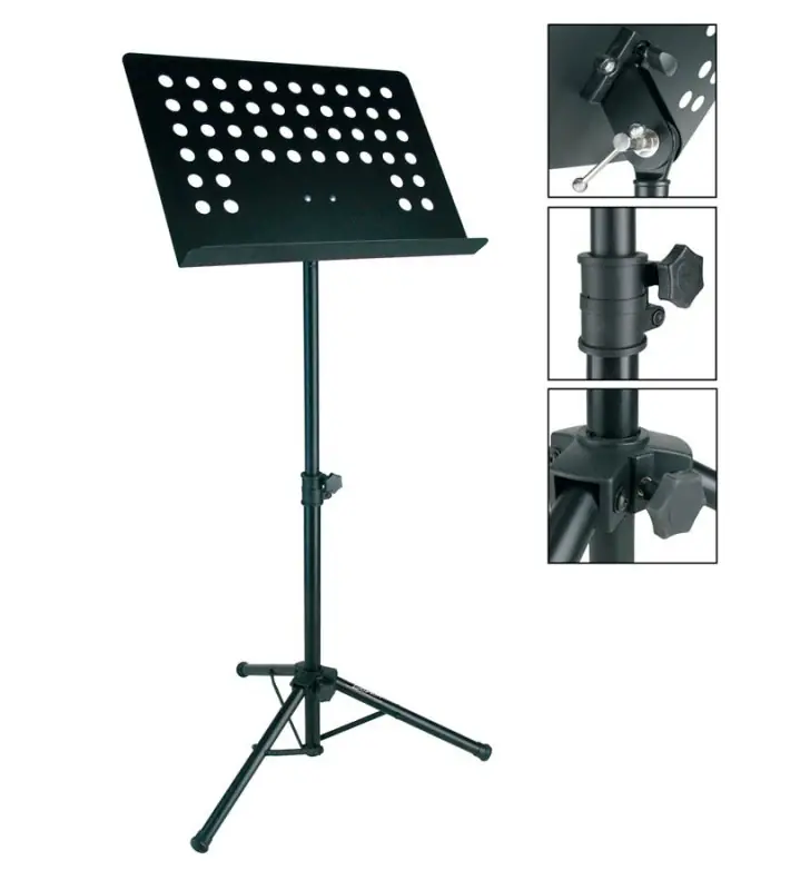 metalen orkestlessenaar, zwart, geperforeerd afneembaar blad, 48x35cmEen stabiele lessenaar is een rustpunt voor iedere musicus.Geen zorgen dat hij omvalt bij ’t wisselen van je bladmuziek of als je er toevallig eens met je voet tegenaan stoot.De oerdegelijke Boston OMS-302 staat stevig op zijn 3 stalen poten die door zijn rubberen doppen zorgt voor voldoende grip en bescherming van de ondergrond. Hij is met een eenvoudige draaiknop traploos in hoogte te verstellen, waardoor hij eenvoudig en snel op te zetten is.Het geperforeerde blad is makkelijk in hoek te verstellen en indien gewenst eventueel volledig te verwijderen van ’t statief voor vervoer of om op te bergen.Reserveonderdelen zijn los leverbaar!specificaties:Hoogte: 62 – 115 cmBlad: 48 x 35 cmKleur: zwart