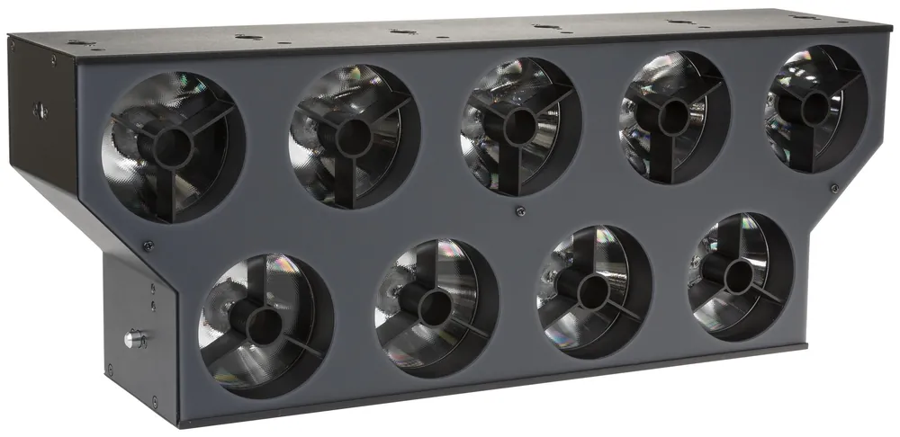 De 9 grote lenzen zijn elk uitgerust met 60W CW/WW leds die erg krachtige 4° witte bundels produceren. (op vol vermogen: 175.000 lux op 3m!)