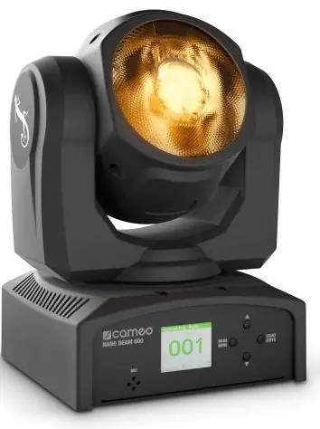 The Cameo Nanobeam 600 is a Beam lyre.Small in size, big in performance: The Cameo NANO beam 600 is a lyre projector with Pan 540° and Tilt 270°. It incorporates a 60 Watt LED that generates rich color mixtures, the beam angle is only 5.2°.the lyre can be controlled in 5 DMX modes. The NANO Beam 600 is equipped with automatic and sound control.Strobe and dimmer functions. It can be used as standalone, master or slave. Navigating through the menu, as well as configuring, is as simple as possible thanks to the large TFT display and the 4 function keys.The composite housing of the NANO Beam 600 is made of impact-resistant ABS and metal. It is equipped with a silent fan, an IEC mains socket and 3-pole DMX connections. The supplied omega bracket offers many mounting options for the projector.