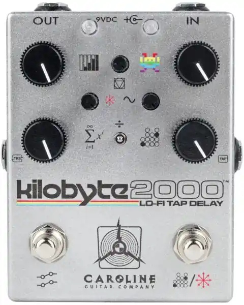 CAROLINE GUITAR Kilobyte-2000 Lo-Fi Tap Delay is an updated version of original 2013 Kilobyte™ pedal. The Kilobyte stood out as special in a crowded delay market with pristine digital delays, early “delay computer” multi-fx, part-for-part clones, software emulators seeking to recreate the classics, and other designers attempting to use the PT-2399 to impersonate analog delay units.Instead of trying to clean that chip up or make it super dark to sound “analog”, it was mader nastier. And the KB-2000 fully realizes the frequency and bandwidth compromised design of the original.The “invader” repeater preamp pushes the gain on the repeats up to 5x harder than the original, while leaving the dry signal untouched and capable of staying clean when dialed back. A new “sharpness” control allows the user to set the gain range and voicing of the preamp. Tap tempo and trails bypass are on board, a gorgeous but subtle modulation is included, and our beloved “Havoc” runaway hold with its voiced runaway is here, but now with a new control to set the intensity of the effect.A dedicated effects loop now allows users to put other effects just on the KB2K repeats, or to get a 100% wet output for different uses.
