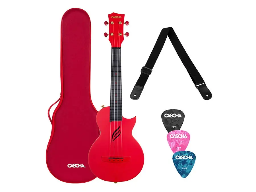 The red Cascha Carbon Ukulele convinces by its uniqueness and the outstanding sound. It is made of carbon fiber from headstock to body. Therefore the ukulele is easy to clean and is generally more resistant to external influences. Compared to ordinary ukuleles, the Cascha Carbon Ukulele has a brighter and more differentiated sound and can also impress with its durable and high-quality construction. Thanks to its light weight and thin body, the ukulele is easy and pleasant to play without having to accept any loss of sound.