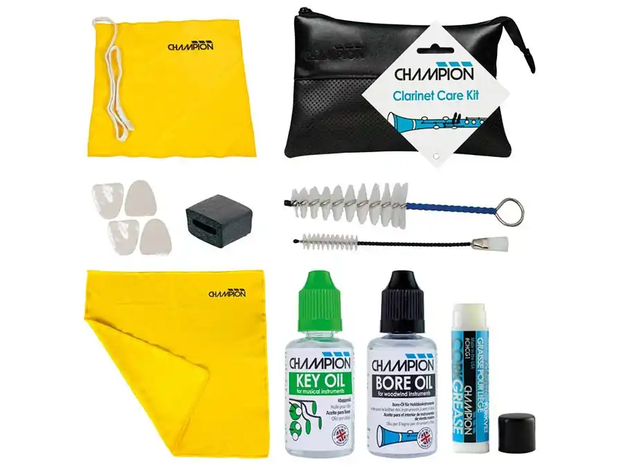 1 x Champion Cork Grease (CHCG1)1 x Champion Key Oil (CHKO1)1 x Champion Bore Oil (CHBO1)1 x Champion Clarinet Pull-Through (CH332)1 x Champion Woodwind Brush Set (CH8199)1 x Champion Polishing Cloth (CH334)1 x Champion Patch-eze Clarinet Mouthpiece Patch – Pack of 4 (CH1052P)1 x Champion Clarinet Thumb Rest Cushion (T2203)1 x Champion Accessory Pouch (CHACP1)