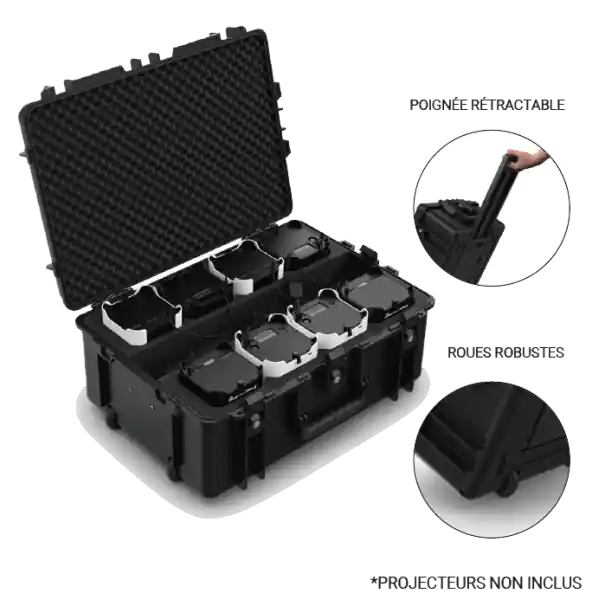 Transport case with wheels that simultaneously recharges up to 8 Freedom Par fixturesMade of durable polypropylene material resistant to water and shocksCustom molded interior for seamless transportDirectly integrated charging bases into the case for easy handling, no need for individual power cablesSturdy wheels and a telescopic handle ensure stress-free transportMultiple child-proof latches and the option to add padlocks to prevent unwanted intrusions