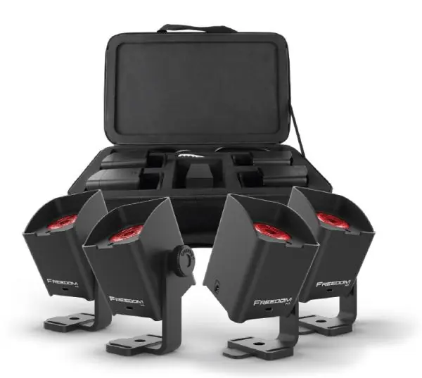 Pack of 4 Chauvet DJ Freedom H1.Experience cutting-edge lighting innovation with our 100% TRUE wireless, battery-operated LED wash lights equipped with a built-in D-Fi transceiver. Say goodbye to cumbersome cables and embrace total freedom to illuminate any space.Our all-in-one system includes 4 LED wash fixtures, 4 diffusers for even light distribution, a convenient carry bag, a multi-charger to keep your lights ready to go, and an IRC-6 remote control for easy remote operation. No more worries about complex setups, as our compact solution provides effortless transport and setup.Versatility is key with these LED lights. You have the option of multiple control modes, whether in standalone mode for simple operation, wireless DMX for advanced customization, or IR (infrared) mode for easy remote control. The built-in digital display makes managing and adjusting all settings a breeze, allowing you to create the perfect ambiance for any occasion.When it comes to installation, you’ll appreciate the magnetic base that makes it easy to mount the light on most metal surfaces. This offers unmatched flexibility in positioning the lights wherever you desire. Moreover, the integrated Kensington security slot prevents theft, providing extra peace of mind when using these valuable lights for your events.Bring your parties, weddings, shows, or any other events to life with these premium, wireless, battery-powered LED lights. Explore cable-free lighting and limitless creativity while enjoying unparalleled ease of use. Choose freedom, flexibility, and quality with our battery-operated LED wash system.”