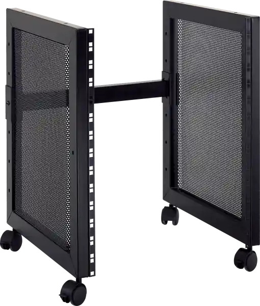 The 14U rack stand with transport wheels is offered by the Quiklok brand