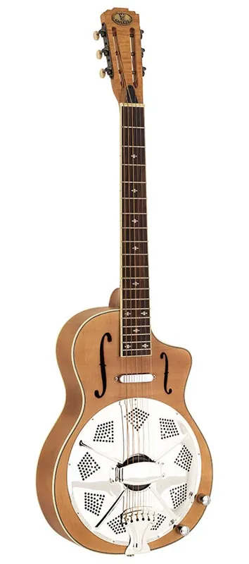 The Royall Bantam Blazer small body resonator guitar is not only cool to look at, it is extremely comfortable to play and still has that typical high-quality resonator sound.The Bantam Blazer is a maple body resonator guitar in parlor size. The beautiful flamed maple body and the 14th fret body connection are just begging to be played onstage. The neck is 46 mm wide at the nut enabling all playing styles.