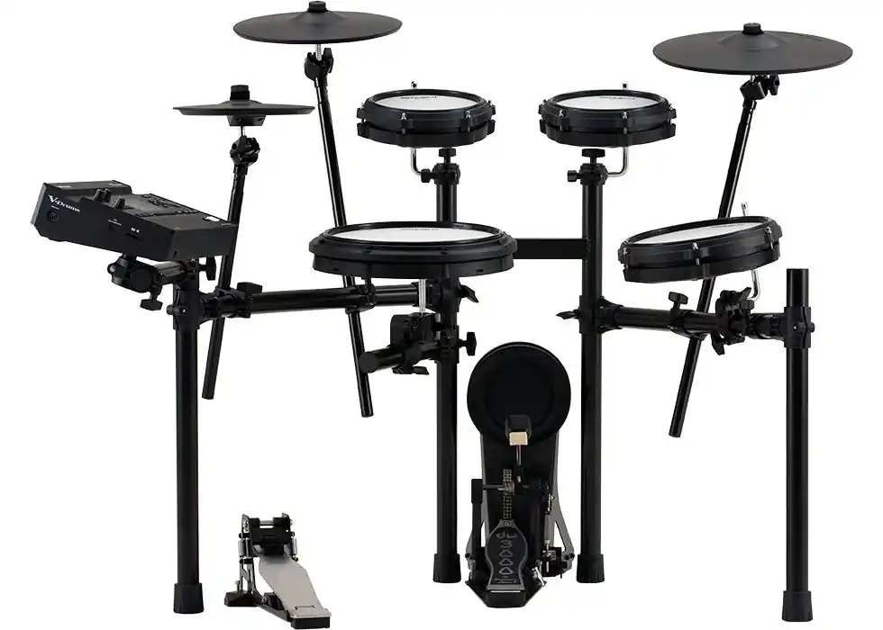Roland drumstel model TD-313 V Drums incl. rekZonder de afgebeelde hihatstand en het voetpedaal !De Roland TD-313 V-Drums is een compact, elektronisch drumstel uit de V-Drums 3 Serie dat high-end geluid en speelbaarheid combineert in een ruimtebesparend ontwerp. Het is ideaal voor thuisgebruik, oefensessies en studio-opnames en maakt gebruik van dezelfde geavanceerde geluidsengine als Roland’s topmodellen.Belangrijkste KenmerkenV31 Sound Module: Het hart van de set is de krachtige V31-module, die meer dan 1.000 instrumentgeluiden en 200 drumkits (waarvan meer dan 70 presets) biedt. Deze module bevat samples die in samenwerking met Drum Workshop (DW) zijn gecreëerd en biedt toegang tot extra geluiden en uitbreidingen via de Roland Cloud.Realistische Pads: De kit is uitgerust met gaasvellen (mesh heads) voor een authentiek speelgevoel en dynamische respons.Snarepad: Een PDX-12 snarepad van 12 inch met detectie van rimshots en cross-stick voor realistische technieken.Tom Pads: Drie tom pads (twee PD-8H en één PD-10H vloertom) met verbeterde sensoren voor nauwkeurige tracking.Kick Pad: Een KD-10 kick pad die een akoestisch speelgevoel nabootst met minimale geluidsoverdracht naar de vloer, ideaal voor appartementen of laat oefenen (let op: basdrumpedaal is niet inbegrepen).Expressieve Cymbals: De set bevat een dual-zone crash (CY-12C-T) en een drie-zone ride (CY-14R-T) met natuurlijke beweging en choke-controle. De hi-hat is een compact CY-5/FD-9 combinatie.Connectiviteit en Oefenfuncties: De module ondersteunt moderne functies zoals Bluetooth-audio streaming om mee te spelen met muziek, USB-C multi-channel audio/MIDI voor eenvoudige DAW-integratie, en Wi-Fi-connectiviteit. Een geïntegreerde coachmodus met tools zoals een phrase trainer en stroke monitor helpt bij het verbeteren van vaardigheden.Compact Ontwerp: De kit wordt geleverd met een stabiel MDS-Compact rack dat is ontworpen om in kleinere ruimtes te passen..
