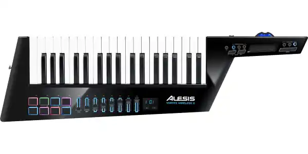 The Keytar Alesis Vortex Wireless 2 master keyboard can be connected in USB, Midi or wireless via a compatible Mac and PC dongle. For maximum mobility on stage, the keyboard can be powered by 4 AA batteries (not included).The Vortex Wireless 2’s numerous controls deliver the power and functionality that keyboardists need for boosted expressiveness.Included Ableton Live Lite, Air Music Technology’s Hybrid 3, Loom 2, Vacuum Pro, and Xpand! 2 virtual instruments, Way Out Ware TimewARP 2600, and editing software developed specifically for the controller.