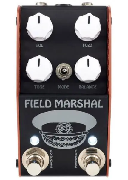 The THORPYFX The Field Marshal Fuzz compact effect pedal is a MKII version of the Big Cheese Fuzz. Smaller, louder and more tonally flexible than the original it sits perfectly on a modern pedalboard. The tonal flexibility is provided through a tonestack bypass foot switch that allows you to have two different fuzz sounds from the same pedal. The balance control is linked to the tonestack bypass and can be set to the same volume as your core sound or as a boosted fuzz for solos.Each Field Marshal pedal offers the following features:Four knobs to control Volume, Fuzz, Tone, Balance.Two footswitches, on/off and tone stack bypass.A three-way toggle switch for gated fuzz, flat mids and enhanced mids.A beautiful laser cut black anodised aluminium enclosure wrapped in a metallic orange base.Engineered to be robust but functional with recessed knobs, sloped front and top mounted jacks.9-volt operation and standard DC inputInternally the pedal is immaculately built using premium 1% metalfilm resistors, Wima and Panasonic capacitors, and Neutrik jacks. These are the crème de la crème of the electronics world and when coupled with a robust gold plated PCB and dust sealed potentiometers the recipe is as good as it can possibly be.