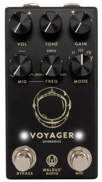 The WALRUS AUDIO Voyager Preamp/Overdrive MKII (Black) is a mid-focused overdrive/preamp that contains all the mythical magic from the original Voyager and adds a wealth of features not seen before in a Klon-style pedal. From its lowest to highest settings, the Voyager provides a uniquely superb amount of clarity to any playing style.At lower gain settings, it brightens the signal and adds clarity to each note. With the gain turned up, the Voyager transforms into a thick overdrive, providing depth to chorded playing while retaining the clarity needed to break through solos.The Voyager MKII breaks out of the traditional Centaur three-knob topography by adding a foot-switchable parametric mid-frequency EQ with a boost/cut range of +/-12dB. The Freq (Frequency) knob then controls the center frequency of where the Mid knob is set, giving a range of 250Hz-2kHz. Great for accommodating any guitar and pickup combination and tailoring your tone to your own style of playing.