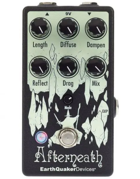 The EARTHQUAKER DEVICES Afterneath Reverb V3 compact effect pedal sounds a lot like it looks – a wizard bursting forth from ethereal cave and ready for the ambient battle. You are the wizard – or sorceress, if you prefer – and the cave is your instrument’s signal, vast, expansive, and magical. Do you go inside? Roll a D20 to proceed! Once inside, a reflection of light from an unknown source catches your eye, and you notice a bizarre sheen on the walls of the cave. You timidly inch closer to the walls of the cave. Placing your hand gently on the cavern wall, you feel the rock move. The cave is alive! Alarmed, you emit a loud gasp, which reverberates throughout the subterranean landscape. Upon further listening, it appears as though the reverberations of your voice are in fact a swarm of short digital delays which may be used to create wild and cavernous reverbs, or scattered, short, rhythmic delays with bizarre characteristics. Take a moment to consider your Intelligence and Wisdom scores, as well as your spell inventory before proceeding further. You have seven spells at your disposal… Will you cast “Length,” which controls the decay length of the reverb? What about “Diffuse,” which adjusts the spread of the reverb? With your wand (or just the knob) turned counterclockwise, the reverb is sharper with more attack, resulting in a stuttering sputter of individual early reflections. Clockwise casts a washy, more ambient-sounding hex. Overwhelmed by fear, you hastily cast “Dampen!” As you shout the incantation, you notice that a counterclockwise variation of this spell results in brighter tones, while as you rotate your wand clockwise; you hear darker tones with a mellower top-end. It’s almost as if your magic changes the hardness of the cavern walls, and thus the tonal characteristics of the reverb! Elsewhere in your book of magic is “Drag,” which separates the individual digital delay lines, literally dragging them through the very fabric of time and space towards an unknown event horizon from which they may never return. Clockwise “Drag” positions will gather the delay lines close together for a more reverb-like effect. Turn the “Drag” counterclockwise, and the delay lines will begin to pull apart for a scattered ping-pong delay effect. The Drag can be put under voltage or expression control using the “EXP” jack located on the side and operates in 9 different modes which are selected by the small “Mode” control. These modes are: Unquantized, Unquantized with slew, Unquantized volt/octave,Chromatic scale, Major scale, Minor scale, Pentatonic scale, Octaves & fifths and Octaves. These modes drastically change the way the Drag control functions, especially while using an expression control or CV.The “Reflect” alters the depth of the cave, and with it the regeneration of the reverb. This acts as a feedback control and will self-oscillate if cast by a high-level user. Turn clockwise for more wash and echoes, counterclockwise for less. Finally, the “Mix” alters the alchemical balance between the input signal and the effect. The Afterneath does not go fully wet but does lower the level of the input signal as you raise this control to create the appearance of a fully wet reverb.
