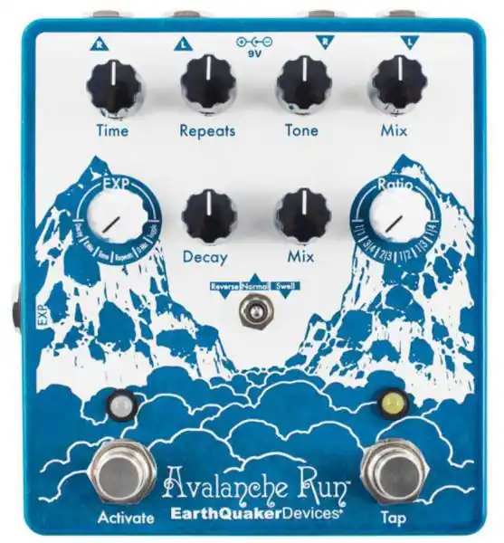 EARTHQUAKER Avalanche Run Stereo Reverb and Delay V2 is a powerful and versatile effect pedal with Tap Tempo. The Avalanche Run is a dreamy sonic discovery device with up to 2 seconds of delay time and a lush stereo reverb. It features complete control over delay time, repeats, mix and voice (with the tone control), as well as control over the reverb length and mix. It can run in one of 3 different modes : Normal, Reverse and Swell. In “Normal” mode, the Avalanche Run functions as a straightforward delay and reverb. In “Reverse” mode, the delay line is in reverse and the reverb remains in normal mode. In “Swell” mode, the Avalanche Run reacts to your picking dynamics and adds a volume swell to the entire signal path much like manually raising and lowering the volume of your guitar. The Avalanche Run features an expression jack that can be assigned to one of six different controls using the “EXP” selector switch. It also features Tap Tempo with six different ratios accessed via the “Ratio” selector switch. The Avalanche Run can also be run in “True Bypass” mode or “Buffered Bypass” mode for trails and features 5 different tail lengths including “Infinite” for lo-fi and continuously degrading pseudo-looping.