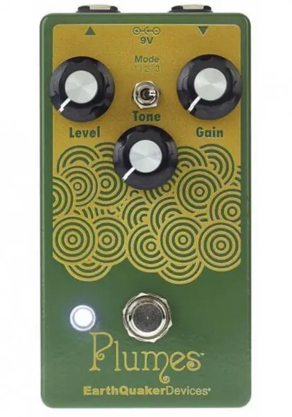 EARTHQUAKER DEVICES Plumes Small Signal Shredder is an overdrive based around that classically overdone tube-like circuit you all know, and amps crave. While this particular circuit has been done to death, we here at EarthQuaker Devices brand of special effects pedals think the Plumes offers an original take on the old, tired dead horse everyone loves to beat on. You can’t get enough of it, so we are giving you some more. Doctor’s orders and what not….For starters, EarthQuaker Devices have done away with the sacred 4558 IC and the classic BJT transistor buffers and replaced them with JFET operational amplifiers and raised the input impedance to nearly 10 megaohms ! This offers lower noise, better signal integrity and more chime in the high end.This OpAmp is powered by taking the 9v input and internally converting it to +/- 9v to give it more headroom. The end result is a more three-dimensional tone with added clarity that really pushes a nice tube amp over the edge. You might notice how those badass leads you’re always ripping will blast over those awful, no good cymbals your drummer is constantly bashing around on. It sounds like diamonds…a million f**king diamonds ! Three different clipping options for your consideration : – Mode 1 is symmetrical clipping utilizing a pair of light emitting diodes. This is the crunchiest setting the Plumes has to offer. When played through a clean amp, it’ll deliver a reasonable facsimile of that classic black and gold British valve amp tone. If you already set your amp dirty, using this mode will make it filthy.- Mode 2 is clean boost mode. This eliminates the soft clipping diodes altogether and leaves you with straight OpAmp drive. This is perfect for pushing your clean tone out in front or driving the preamp of an already overdriven amp into tasteful breakup territory.- Mode 3 is an asymmetrical silicon diode arrangement similar to the stock screamer but with more output and clean clarity; the tone some people describe as “transparent”. It’s almost as if your clean tone is blended in with a slightly less clean tone, ya know? Using this mode gives a warmer low-end response and lower output. It’s less hard on your amp and your ears. It’s a classic pleasant tone the whole band can enjoy.