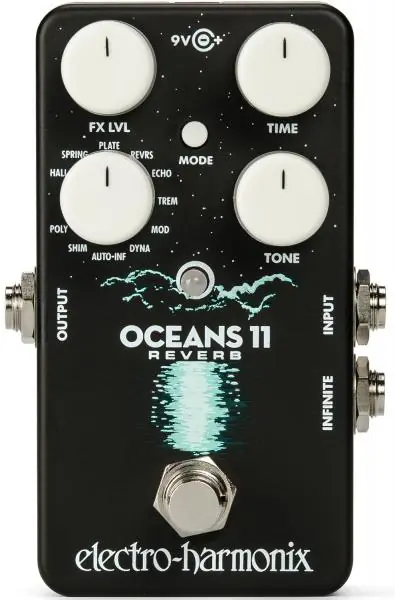 EXH Oceans 11 Reverb is a compact and powerful digital reverb pedal with 11 presets and many functionalities. Splash your tone with subtle ambience using classic Hall and Plate, or drench your guitar in surreal soundscapes with Shimmer and Modulation.A Spring algorithm faithfully emulates the iconic drip of vintage Fender reverb units. Unique and powerful polyphonic, dynamic, and autotriggering reverbs inspire radical experimentation. Instantaneous controlof infinite reverb unleashes a torrent of sonic possibilities for a truly unparalleled reverb experience.Each reverb type on the OCEANS 11 has up to three unique modes of operation. Pressing the MODE button cycles through these availablemodes (the LED color – green, red, or orange – shows the current mode. if the LED does not change color when pressing this button, the active reverb type has only one mode). When you switch reverb types, theOCEANS 11 will recall the last mode you were using in that reverb type.In most OCEANS 11 reverb types, infinite reverb is accessible. Infinitereverb increases the decay time of the currently-selected reverb to infiniteand redirects the musician’s playing to a fresh reverb of the same type.Infinite reverb also disables the MODE button and overrides the TIME andTONE knobs such that they respectively control the TIME and TONE knobsof the fresh reverb. This allows you to sculpt the fresh reverb sound toyour liking without altering the infinite reverb in the background.The OCEANS 11 allows you to choose whether reverb continues to play or stop immediately after the pedal is switched tobypass (Tails switch inside the box).