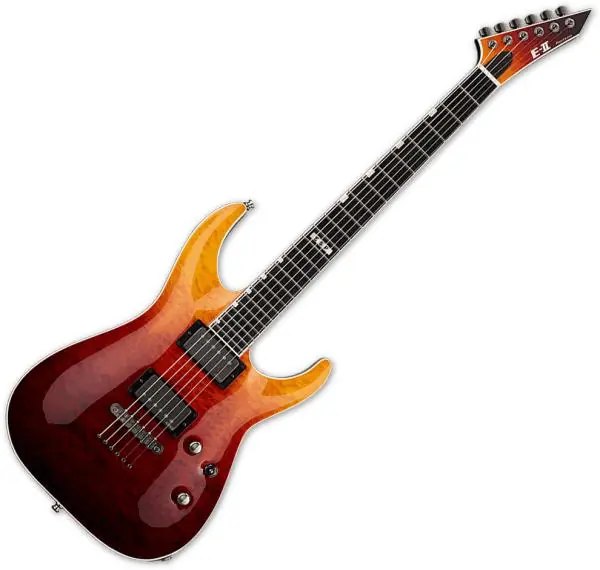 The ESP E-II Horizon NT-II (TEAF) solid body electric guitar is a sustain-lover’s dream, with neck-thru-body construction as well as a Gotoh TOM bridge with string-thru-body design. Built in Japan with a stunning Tiger Eye Amber Fade finish over its figured quilted maple top, the E-II Horizon NT-II offers a 3-piece maple neck and a mahogany body, an ebony fingerboard, and 24 extra-jumbo frets. Ready for everything from super tight rhythms to fluid leads, this guitar includes high-end components like a bone nut, Schaller straplocks, and Gotoh locking tuners. The sound of the E-II Horizon NT-II comes from a set of outstanding active pickups, with EMG 66TW (neck) and EMG 57TW (bridge) in brushed chrome that offer discrete coil-splitting controls for each pickup. Includes ESP hardshell case.