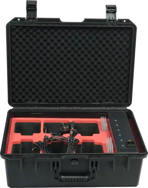 Dankzij het geïntegreerde oplaaddock kun je je 6 EVENT PAR 44 QUAD IP projectoren direct in de koffer opladen, zonder ze te verwijderen. Sluit de koffer gewoon aan op een stopcontact om het opladen te starten. LED-indicatoren geven de oplaadstatus van elke projector aan: rood tijdens het opladen, groen wanneer de batterij vol is. Een praktische en veilige oplossing om tijd te besparen tussen shows.
