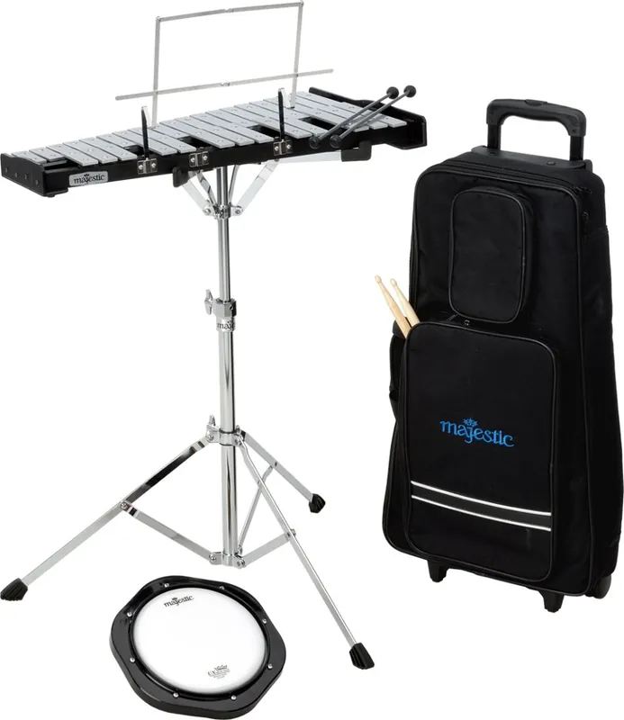 Majestic percussion pack model 32PC in trolleyKlokkenspel: 2.5 octaves F5 – C8Practice pad: 8″, tunable1 paar Mallets1 paar Drum sticks (2B)Music rack / lessenaarStand voor klokkenspelTrolley with retractable handle
