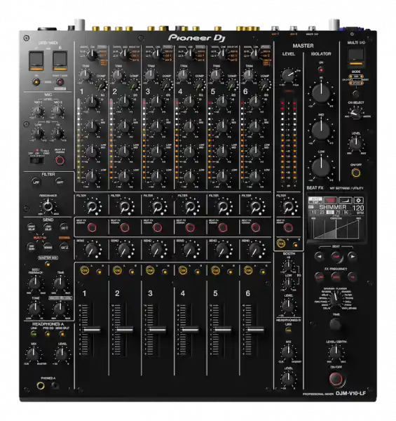 The Pioneer Dj DJM-V10-lf is a 6-channel DJ mixer with long-stroke faders for smooth and accurate mixes.Enjoy the warmth of the natural sound of the mixer and hear every detail of the music. A high-quality 96 kHz/64-bit mixer and dithering process in the DSP, as well as high-quality 32-bit A/D and D/A converters. All this, together with a low-jitter clock circuit, produces full low frequencies in addition to brilliant midrange and accurate highs.Sculpt your sound exactly the way you want it with the new 4-band EQ. The frequencies, curves, boost and cut on each band have all been specially designed to give you total flexibility. Completely isolate the treble and/or bass, and adjust the two mid-ranges – which have their own custom curves – to fine-tune your mix.Send the audio signal to one of the four onboard effects and up to two external devices to create unique sounds and even live remixes. You can connect a variety of devices to the TRS Send/Return jack ports, such as guitar pedals, effects consoles, and more.