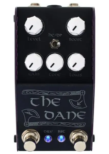 THORPYFX The Dane Overdrive MKII & Booster compacte effect pedal is a creation designed to meet the exacting needs of Danish Pete. However due to the design brief needing to cover the wide palette of sounds he uses, the pedal finished up being the most versatile pedal available on the market for such a clean design.THE DANE has two sides – a complex light to medium gain overdrive on the left and a high headroom super clean boost on the right. The pedal is designed so that the boost runs into the drive side. This yields three distinct tonal variations ranging from clean boost all the way through to full and fat saturation. The pedal is also designed to clean up impeccably from your volume control and as such it is ideal for dynamic players who like to adjust their playing style.