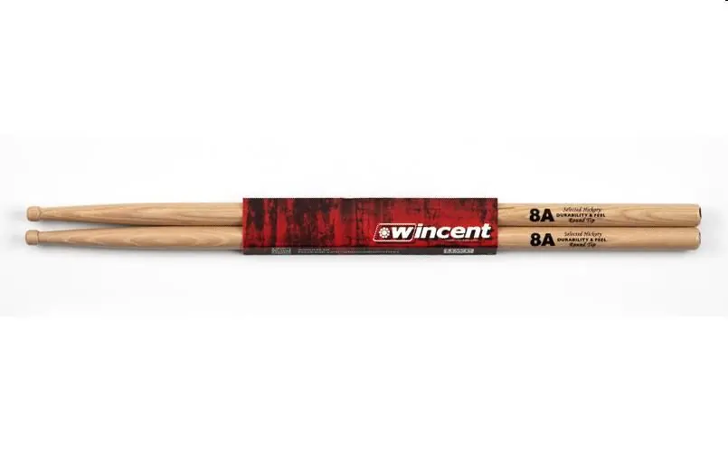 Wincent drumstokken model 8AKentucky Born, Individually Shaped and Paired in Sweden.Stone-ground in Sweden from the choicest cuts of Kentucky-grown American Hickory, Wincent’s Unique Wax Protection (UWP) proprietary sealer is employed for better grip, increased durability and extended playing lifetime.A longer-lasting alternative to traditional drum sticks,Wincent’s 8A model features an extended, gradual shoulder taper for stability and improved balance.Features ball tip for articulate, powerful sticking and Butt-End Branding for quick access.SERIESHickory Drum SticksDIAMETER.551″LENGTH16″TIPWood, Round TipTAPERLong, GradualCOATINGCOUNTRY OF ORIGINSwedenWOOD ORIGINKentucky, USA