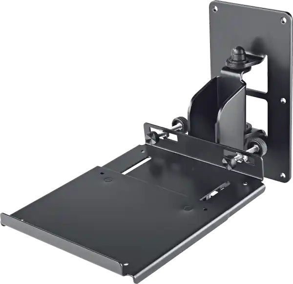 K&M Standaard voor monitoren en luidsprekers. Er zijn 2 bevestigingsschroeven meegeleverd om de ondersteuning te beveiligen. Het deel dat de luidspreker ondersteunt, kan worden aangepast in diepte van 115 tot 250 mm.