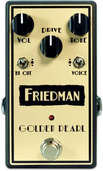 The FRIEDMAN AMPLIFICATION Golden Pearl Pedal is a transparent, lower gain overdrive pedal designed to push already overdriven amps into seductive saturation. This versatile pedal can also be used into a clean amp to achieve that elusive semi-broken up tone.Designed to please the ultimate tone connoisseur, the responsive controls, along with the three position high-frequency cut switch, let you custom tailor the pedal to your amp.Even greater refinement is available via the tri-mode clipping mode switch, which provides LED, diode, or no clipping voice options. Built in the USA, and designed to withstand decades of abuse, the Golden Pearl is a must have pedal for any guitar player.