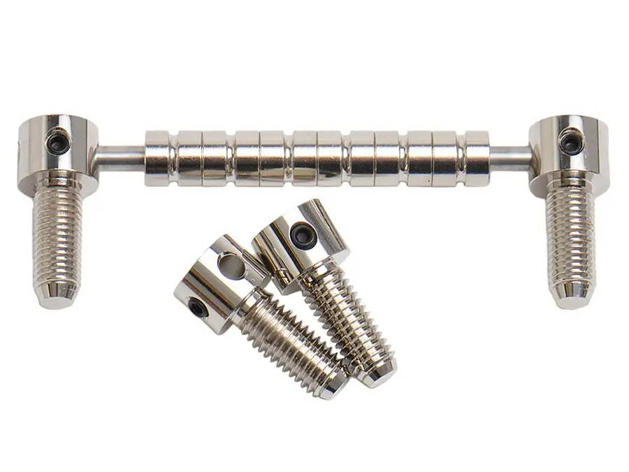 The mounting screws of The Downholder are supplied in both metric and US thread sizes. The spacing of the mounting studs can be adjusted in a wide range. The axle is simply pushed loosely through the mounting holes of the studs and then fixed with one allen screw on each side.Axle: stainless steelRollers and Posts: brass