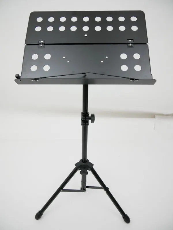 Jinbao lessenaar model MS-16M met inklapbaar bladmetalen orkestlessenaar met papierklemmen, zwart, geperforeerd afneembaar blad, 49x34cmHet blad is inklapbaar dus makkelijk meetenemen(weinig ruimte)De lessenaar heeft een zwart geperforeerd blad en is traploos in hoogte af te stellen. De kanteling van het blad is gemakkelijk af te stellen met een robuuste kunststof draaiknop. Hij is uitgerust met een stabiele 3-poot voorzien van kunststof doppen voor optimale grip en bescherming van de vloer.Uitgerust met 2 handige papierklemmen zodat uw bladmuziek niet meer bij ieder briesje op de grond ligt.Veel musici gebruiken tegenwoordig een iPad voor hun bladmuziek. Uiteraard kunt u deze ook op deze lessenaarkwijt.Voor transport is het mogelijk het blad met een draaiknop helemaal los te maken van het statief, al is de noodzaak daarvoor niet erg groot, omdat de lessenaar ingevouwen al niet veel ruimte in beslag neemt.Specificaties:Hoogte (gerekend van de grond tot onderkant blad): 70 – 130 cmBovenblad: 49 x 34 cm