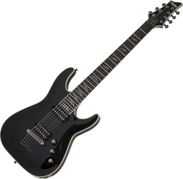 The SCHECTER C-7 Blackjack (#2153) is a 7-string baritone solid body electric guitar made for Hard-Rock and Metal players. It merges traditional Fender©/Gibson© influences with more modern characteristics for raging and thick sounds (Mahogany body, set neck, Ebony fretboard, 24 frets, Lundgren M6 humbuckers, Hipshot fixed bridge, locking tuners). Built in South Korea.