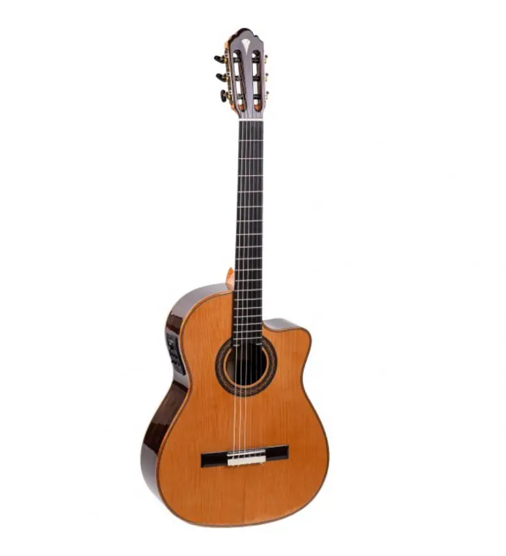 De M50 is Maravilla’s best verkochte Crossover-gitaar. Het instrument kent twee uitvoeringen, met een massief Canadees ceder bovenblad (M50 CD) of Europees sparren (M50 SP) bovenblad. Zij- en achterkant zijn van palissander. Het belangrijkste kenmerk van dit model is het slanke halsprofiel: 48 mm topkambreedte, 16″ toetsradius, met 12 frets tot aan de klankkast. Dit maximaliseert de overdracht van resonantie en trillingen op het boevenblad. De M50 biedt de perfecte mix van een klassiek Spaans ontwerp en moderne looks: een met de hand ingelegde houten rozet, elegante mahoniehouten bindingen en een mooie hoogglans PU finish.